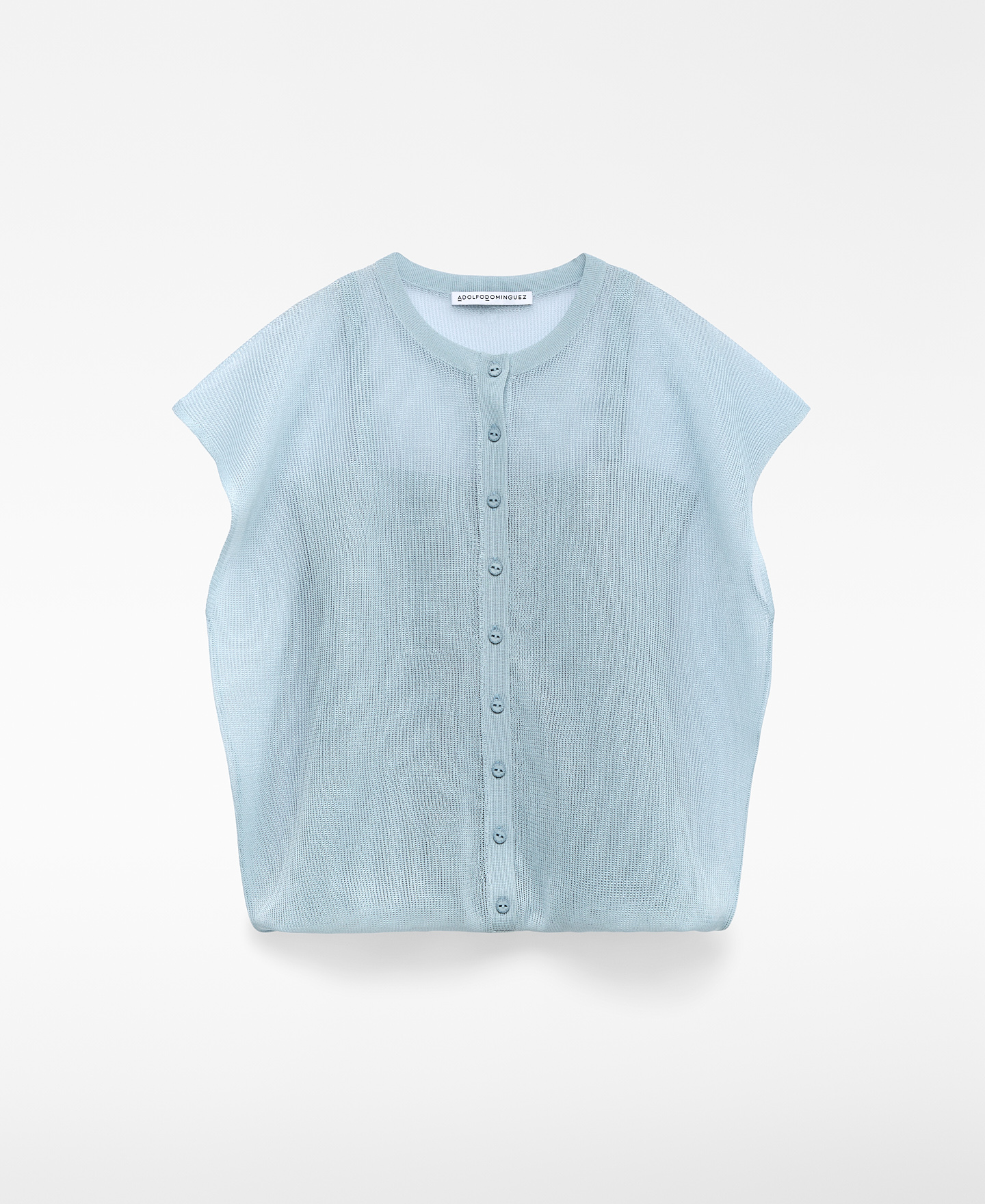 Jersey azul punto combinado mujer. Capa interior con escote recto y tirantes. Capa exterior semitransparente con cuello caja y manga corta.